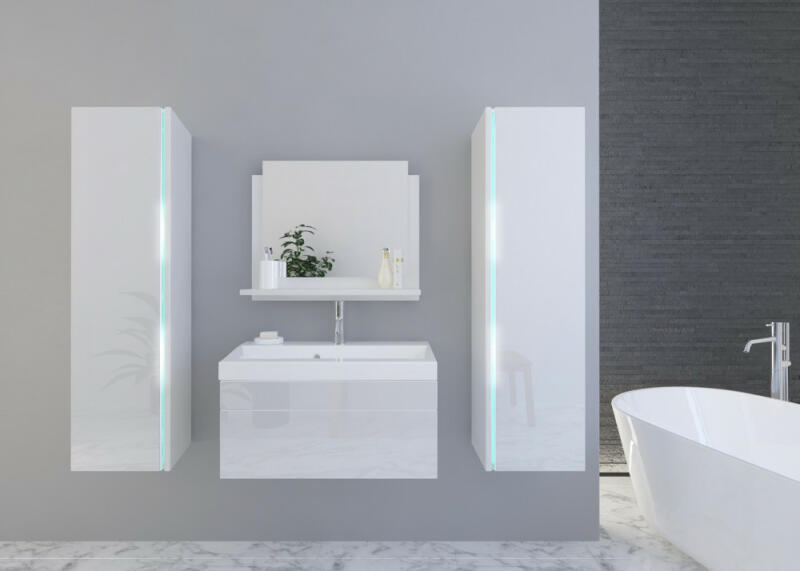Venezia Dream II. fürdőszoba bútor szett magasfényű fehér színben (matt fehér oldalsó elemek). A készlet tartalmazza a mosdószekrényt, a faliszekrényt, a porcelánt mosdót szifonnal és a fali tükröt polccal. A mosdószekrény tágas helyet biztosít a tárolásra, az ajtó a felső rész enyhe megnyomásával lenyitható (push to open rendszer). 16 mm vastag bútorlapok, az élek