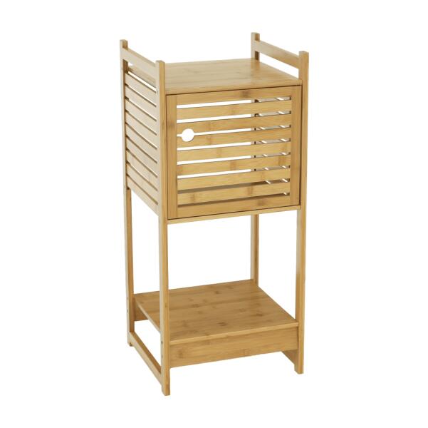 Fürdőszoba bútor > Fürdőszoba kiegészítők > Polcok > Polcos állvány, természetes bambusz, SELENE TYP 1 Anyag: lakkozott bambusz Szín: természetes Méretek (SzxMxMa): 36x33x80 cm Nyitott tárolóhely Három polc Ajtókkal Szétszerelve szállítjuk