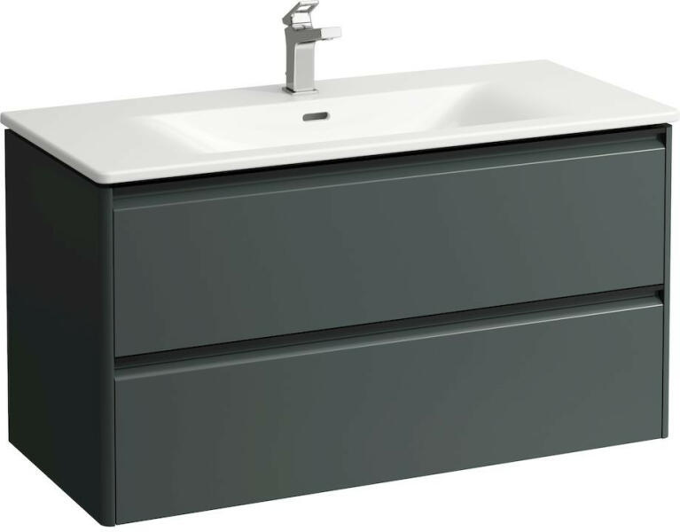 Laufen Palace 2 fiókos alsószekrény mosdóval 100x45 cm, traffic grey H8617072661041 Szerelés: falra Mosdó méret: 100x45 cm Szekrény méret: 98,3x43,8 cm Teljes magasság: 54,5 cm Vékony mosdó alsószekrénnyel Mosdó alapanyaga: kerémia 1 Csaplyukkal 2 fiókkal Soft Closing rendszerrel, fiók rendezővel Fekete alumínium fogantyúval Hagyományos és helytakarékos szifonnal is szerelh