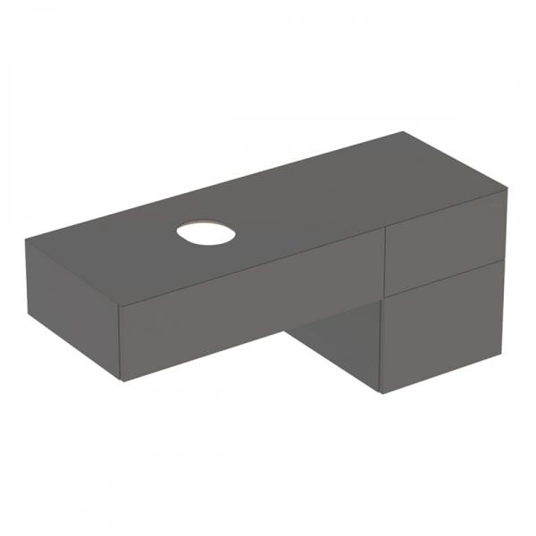 Geberit VariForm alsó szekrény pultra ültethető mosdóhoz 135x51 cm, 3 fiókkal, pakolófelülettel, matt láva 501.190. 00.1 Tulajdonságok Méretek: 135x55x51 cm Szélesség: 135 cm Test és előlap: láva / matt bevonat Takarólap: láva / matt melaminbevonatú Alapanyag: nagy tömörségű háromrétegű farostlemez Alkalmas minden VariForm pultra ültethető mosdóhoz Falra szerelhető H