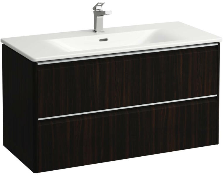 Laufen Palace 2 fiókos alsószekrény mosdóval 100x45 cm, sötétbarna szil H8607072631041 Szerelés: falra Mosdó méret: 100x45 cm Szekrény méret: 98,3x43,8 cm Teljes magasság: 54,5 cm Vékony mosdó alsószekrénnyel Mosdó alapanyaga: kerémia 1 Csaplyukkal 2 fiókkal Soft Closing rendszerrel, fiók rendezővel Eloxált alumínium fogantyúval ( korróziónak ellenálló oxidréteg ) Hagy