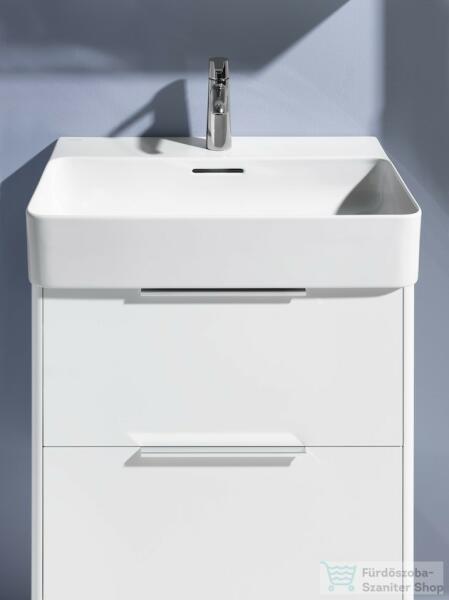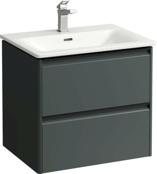 Laufen Palace 2 fiókos alsószekrény mosdóval 60x45 cm, traffic grey H8617022661041 Szerelés: falra Mosdó méret: 60x45 cm Szekrény méret: 57,9x43,8 cm Teljes magasság: 54,5 cm Vékony mosdó alsószekrénnyel Mosdó alapanyaga: kerémia 1 Csaplyukkal 2 fiókkal Soft Closing rendszerrel, fiók rendezővel Fekete alumínium fogantyúval Hagyományos és helytakarékos szifonnal is szerelhet