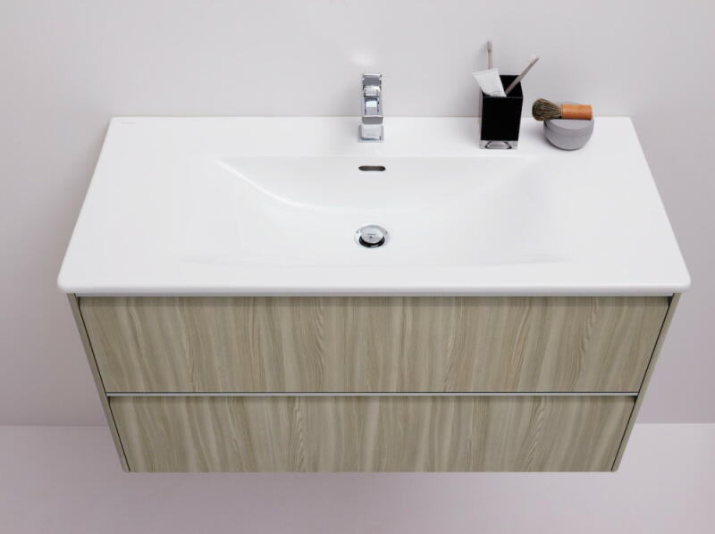 Laufen Palace 2 fiókos alsószekrény mosdóval 100x45 cm, világos szil H8607072621041 Szerelés: falra Mosdó méret: 100x45 cm Szekrény méret: 98,3x43,8 cm Teljes magasság: 54,5 cm Vékony mosdó alsószekrénnyel Mosdó alapanyaga: kerémia 1 Csaplyukkal 2 fiókkal Soft Closing rendszerrel, fiók rendezővel Eloxált alumínium fogantyúval ( korróziónak ellenálló oxidréteg ) Hagyomá
