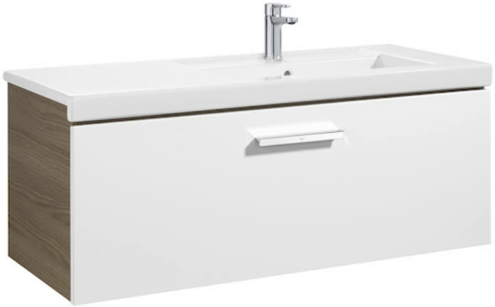 Roca Unik Prisma 1 fiókos alsószekrény jobbos mosdóval 1100 kőris fehér A855949322 Telepítés: falra függesztve Anyag: MDF/laminált Szélesség: 1100 mm Mélység: 460 mm Magasság: 450 mm Kivitel: 1 fiókkal Mosdó anyaga: porcelán Mosdó jobb oldalon Pakolófelület bal oldalon Mosdó mérete: 110x45x13 cm 1 nyitott csapfurattal Szín: kőris/fehér A csaptelep nem tartozék.