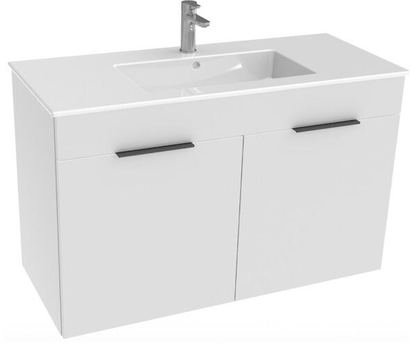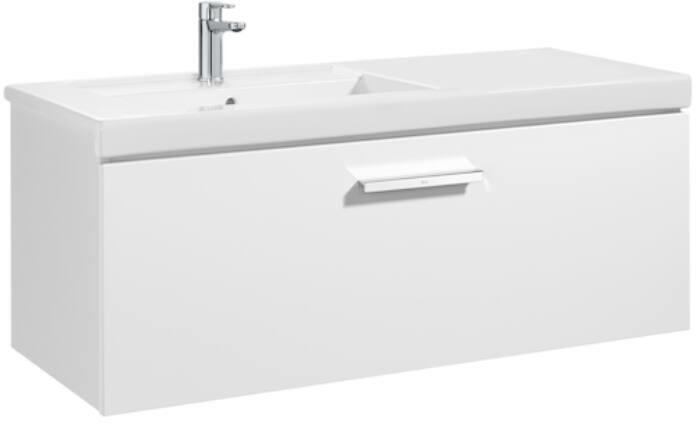 Roca Unik Prisma 1 fiókos alsószekrény balos mosdóval 1100 fehér A855948806 Telepítés: falra függesztve Anyag: MDF/laminált Szélesség: 1100 mm Mélység: 460 mm Magasság: 450 mm Kivitel: 1 fiókkal Mosdó anyaga: porcelán Mosdó bal oldalon Pakolófelület jobb oldalon Mosdó mérete: 110x45x13 cm 1 nyitott csapfurattal Szín: fehér A csaptelep nem tartozék.