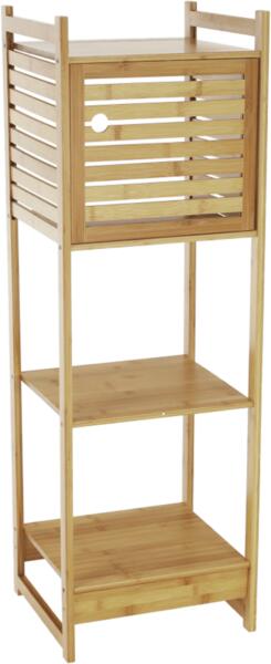 Fürdőszoba bútor > Fürdőszoba kiegészítők > Polcok > Polcos állvány, természetes bambusz, SELENE TYP 2 Anyag: lakkozott bambusz Szín: természetes Méretek (SzxMxMa): 36x33x110 cm Nyitott tárolóhely Négy polc Ajtókkal Szétszerelve szállítjuk