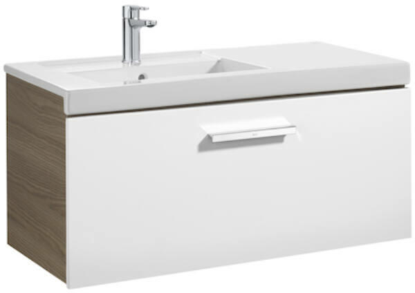 Roca Unik Prisma 1 fiókos alsószekrény balos mosdóval 900 kőris fehér A855946322 Telepítés: falra függesztve Anyag: MDF/laminált Szélesség: 900 mm Mélység: 460 mm Magasság: 450 mm Kivitel: 1 fiókkal Mosdó anyaga: porcelán Mosdó bal oldalon Pakolófelület jobb oldalon Mosdó mérete: 90x45x13 cm 1 nyitott csapfurattal Szín: kőris/fehér A csaptelep nem tartozék.