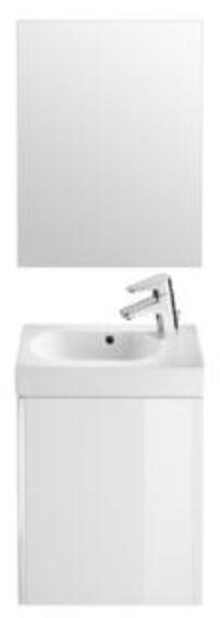 Roca Unik Pack Mini mosdószekrény porcelán kézmosóval és tükörrel Fehér A855865806 Mosdószekrény mosdóval falra szerelés 1 ajtós csapódásmentes alsószekrény 1 polccal dekoratív fém fogantyúval Mosdószekrény szélessége: 45 cm Magasság mosdóval : 57,5 cm Mélység: 25 cm Mosdó anyaga: porcelán Kivitel: jobb oldali csaplyukkal Túlfolyóval Szín: fehér Tükör Széless