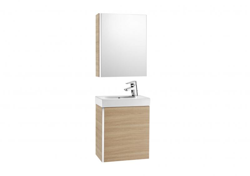 Roca Unik Pack Mini mosdószekrény kézmosóval és tükrös felsőszekrénnyel Tölgy A855866155 Telepítés: falra Anyag: MDF Bútor szélessége: 450 mm Bútor mélység: 250 mm Bútor magassága:500 mm Dekoratív fém fogantyúval Nyitási mód: ajtó (csapódásmentes) Kivitel: polcos Szín: Teljes magasság (bútor + medence) 575 mm Medence típusa: beépített Mosdó alapanyaga: porcelán