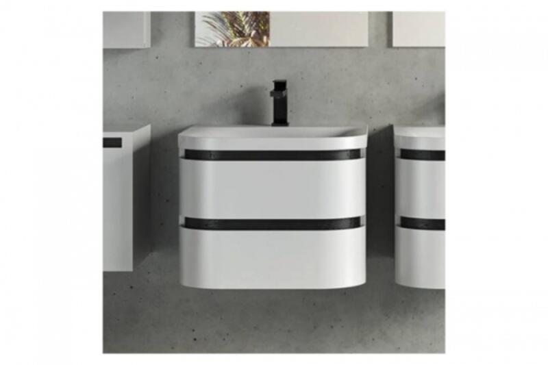 Lekerekített szélű bútorcsalád öntött márvány mosdóval. Bemart fogantyúi mögött a fekete sáv sztenderd, így szépen illeszkedik a fekete profilú kabimokhoz és kiegészítőkhöz. Frontjait és korpuszát illetően három divatos színben rendelhető, a fiókrendező széria tartozék. Ouv 80 alsószekrény mosdóval