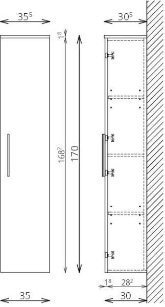 Tboss FAMME 1A kiegészítő fürdőszoba bútor, 1 ajtóval, polcokkal (FANO / ANDA / MILANO / MIRA/ ELKA) Bútorfelépítés // FAMME 1A Korpusz: Vákuumpréselt MDF és laminált lapok Front: Vákuumpréselt MDF Fogantyú: Fém Tulajdonságok: Készre szerelve Extraként rendelhető: Tboss Konzolos láb szett 2 színben (fehér, fekete színben) Tboss Sarokláb pár 2 színben (króm, fekete sz