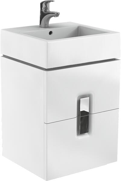Kolo Twins fehér mosdószekrény 2 fiókkal 50 (89489000) 50x57x46 cm falra rögzíthető mosdó külön rendelhető és kombinálható L51150, L51151 mosdóval záráscsillapító pánttal felszerelt fiók- 2db 2 fogantyú kiegészítő 99487 krómozott bútorláb (2 d