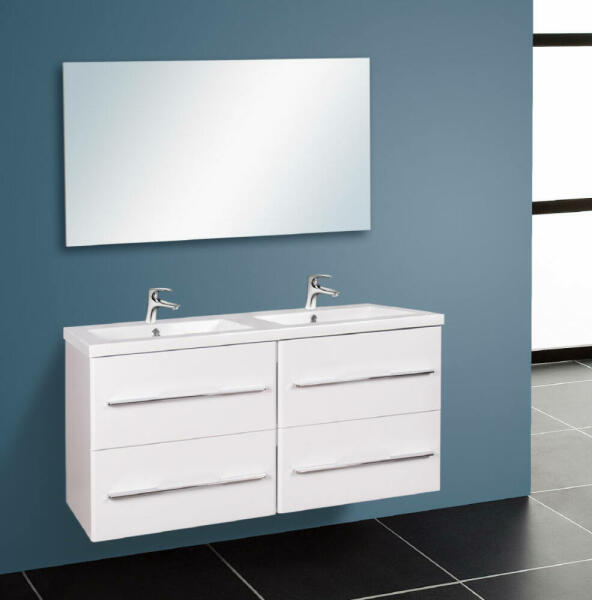 WB00283 – Nina 120, 4 fiókos mosdószekrény Öntött műmárvány dupla mosdó, 4 fiókos mosdószekrény és 120 cm szélességű designtükör. Nina szettünk darabjai akár egy átalakított vagy egy újonnan épített fürdőszoba modern kialakítását is egyaránt szolgálják. Helyszűkében van? Elérhető 60-as és 80-as kivitelben is! Jellemzők: - 4 fiókos mosdószekrény - 15 mm v