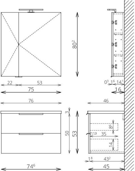 Cersanit Moduo 2 fiókos alsószekrény 80 süllyesztett kerámia mosdóval, fényes szürke S801-315-DSM MODUO szekrény és mosdó szett. Mosdó: a samott kerámiából készült MODUO 80 süllyesztett munkalap egyedi Cersanit White mázzal van bevonva. Garancia: 2 év Súly: 40 kg Telepítés: falra függesztett Anyag: forgácslap/MDF Szélesség: 795 mm Mélység: 447 mm Magasság: 620 mm Kivi