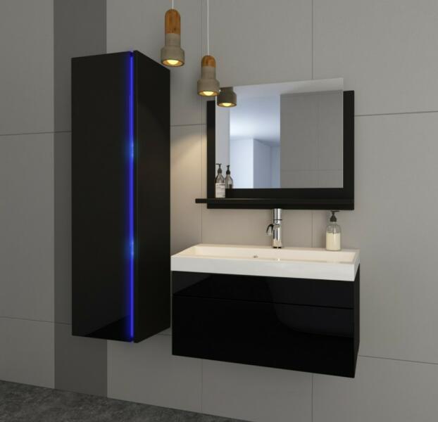 Venezia Dream I. fürdőszoba bútor szett magasfényű fekete színben (matt fekete oldalsó elemek). A készlet tartalmazza a mosdószekrényt, a faliszekrényt, a porcelánt mosdót szifonnal és a fali tükröt polccal. A mosdószekrény tágas helyet biztosít a tárolásra, az ajtó a felső rész enyhe megnyomásával lenyitható (push to open rendszer). 16 mm vastag bútorlapok, az élek A