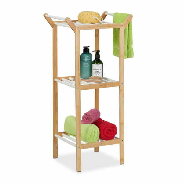 Praktikus törülközőtartó 3 polccal Rendezze stílusosan a törölközőket és a fürdőszobai termékeket a sokoldalú fürdőszobai polccal. 3 tágas tárolórekeszben könnyen elérhető helyen tárolhatja a fürdőszobai textíliákat és fürdőszobai cikkeket. Az oldalsó törölközőtartók tökéletesek vendégtörülközőknek. A bambuszból készült robusztus, nedvességálló fü