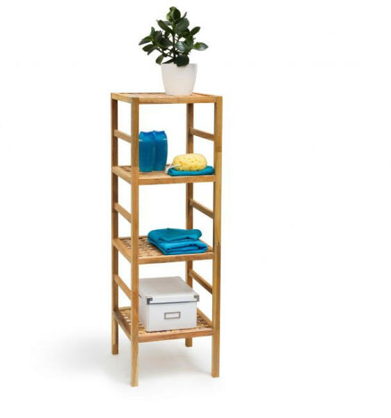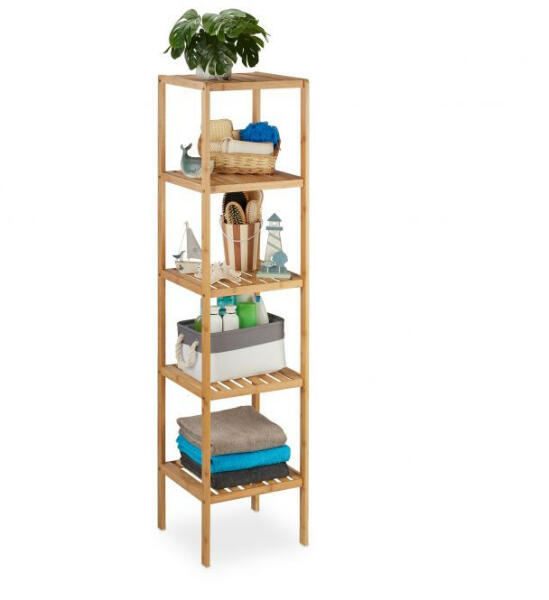 Az 5 polc sok tárolóhelyet biztosít törölközőknek, krémeknek vagy kozmetikumoknak. A bambusz természetes tónusa egyszerű szépséget áraszt. Méret: 140 x 34 x 33 cm Polcok közötti távolság: kb. 28 cm Polconkénti terhelés: kb. 5 kg Súlya kb. 3,8 kg Bambuszból készült