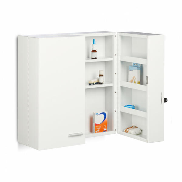 Az extra tágas gyógyszeres szekrény ideális tárolóhely gyógyszerei számára. A 11 rekeszben kényelmesen elférnek a tabletták, a fejfájás elleni gyógyszerek vagy a kötszerek. A magas polcokon nagyméretű palackok és tubusok is elhelyezhetők. Minden gyógyszert gyermekektől védve tartanak. A két ajtó zárható és mágneses. A műanyag ütközők megakadályozzák az ajtók han