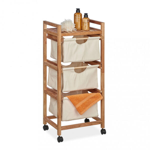 Dekoratív diófa állópolc szövet kosarakkal A kompakt diófa fiókos polccal praktikus tárolóhelyet alakíthat ki kis és nagy fürdőszobákban. A nyitott polc és a 3 szövetfiók okos kombinációjával. Míg a polc tárolóhelyet kínál a kozmetikumok vagy egyéb fürdőszobai eszközök számára, a kosarak ideálisak a piszkos ruhanemű válogatására vagy a törölközők tárolás