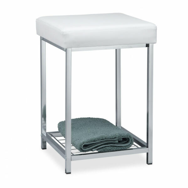 A kis zsámoly elvarázsol elegáns, mégis egyszerű kialakításával. Krómozott vázával és műbőr borítású, kárpitozott ülésével lenyűgöző. Az integrált polc különösen praktikus, és helyet biztosít magazinok vagy kedvenc regényei számára. Használja a kárpitozott zsámolyt kis ülőhelyként a fésülködőasztalnál, a nappaliban vagy a folyosón, fürdőszobai ülőke