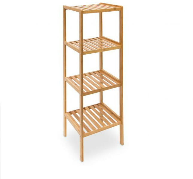 Bambuszból készült állványpolc, kis helyigény mellett sok tárhelyet teremt. 4 polc kozmetikumoknak, törölközőknek, fürdőszobai kiegészítőknek egyéb tárgyaknak. Konyhába, nappaliba vagy előszobába is alkalmas. Teljesen rugalmas és nedvességálló bambuszból készült. Nem kell a falhoz rögzíteni - egyszerűen szabadon elhelyezhető. Méretek: 110 x 34 x 33 cm A polcok köz