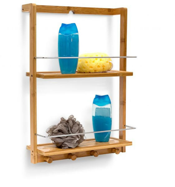 Fali polc a konyhához és a fürdőszobához, Sokoldalú fali polc, rengeteg tárolóhely a 2 polcon. Polconként 5 horony lehetővé teszi a víz elvezetését. Fém támaszok a nagyobb tárgyak és palackok stabil tartásához. Praktikus mélyedés a könnyű felakasztáshoz. Méretek: 53 x 38 x 15,5 cm Nedvességálló falipolc bambuszból Az alsó polc: 23 cm magas Fém tartóelemek (krómozo