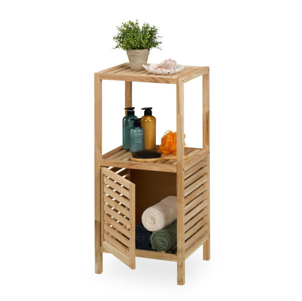 Fürdőszoba polc ajtóval és 2 polccal F Az állópolcon rengeteg tárolóhely van mindenféle fürdőszobai eszköz számára, melyek könnyen elérhető helyen tárolhatók 2 nyitott polcon és egy ajtós szekrényrekeszben. Kompakt kialakításának köszönhetően a fapolc kisebb helyiségekbe is ideális. A háztartási polc a konyhában is jól mutat, ahol kellékek, kávé- és teásdoboz