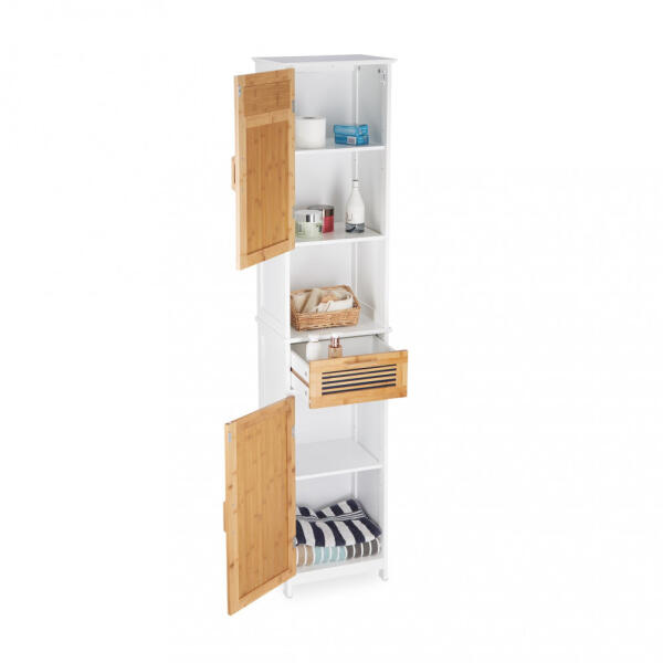 Tágas, fehér fürdőszobai szekrény A bambuszból készült, dekoratív magas szekrény ajtókkal és fiókkal, kis helyigény mellett rengeteg tárhelyet kínál. A magas, rácsos megjelenésű szekrényben öt polccal elegendő törölköző és fürdőszobai kiegészítő tárolható. A mágneses ajtótartó gondoskodik arról, hogy a szekrényajtók különösen finoman csukódjanak. A megf