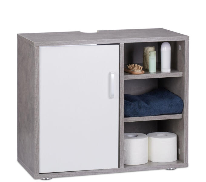 Modern fürdőszobai alsó szekrény A mosdókagyló alsó szekrénnyel nem csak az ajtós rekeszben tárolhatja a szükséges tisztítószereket, hanem ésszerűen használhatja ki a nyitott polcokat is. Ezek tökéletesek a fürdőszobai szükségletekhez, például törölközőkhöz és WC-papírokhoz, amelyeknek kéznél kell lenniük. A 4 láb védi a szekrényt a kis tócsáktól, amelyek g