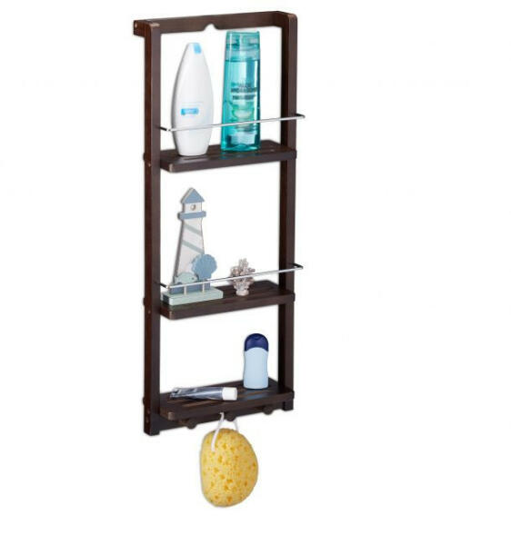 Bambusz fürdőszoba polc törölköző akasztóval sötétbarna Fali polc fürdőszobához vagy konyhához 3 szint samponokhoz, tusfürdőkhöz, fűszernövényekhez 3 horoggal a törülközők és konyharuhák számára A hasadékok megakadályozzák a víz felhalmozódását Nedvességálló bambuszból készült Fürdőszoba polc mérete és anyaga Méret: H x Sz x M: 70 x 28,5 x 10 cm Súly:
