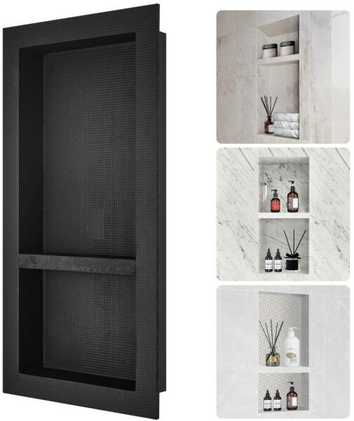 Burkolandó polc Méret: 10 x 40,64 x 81,28 cm Típus: 2 polc Anyag: XPS műanyag Szín: fekete Súlya: 2,1 kg További információk:Fürdőszobai polc 2 polcos Zárt és 100%-ban vízálló burkolandó fürdőszobai polc. A polc extrudált XPS hablemezből készült. Ez nemcsak a falat védi és meghosszabbítja a fal élettartamát, hanem hatékonyan megakadályozza a víz bejutását a falba,