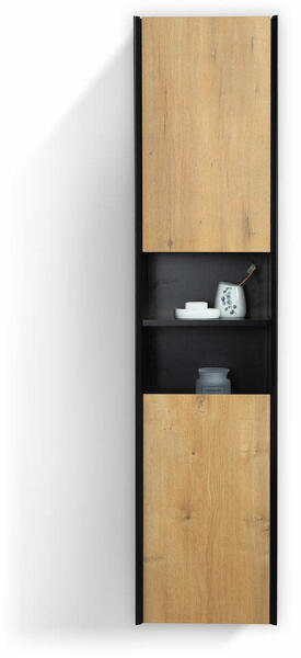 A fekete és a tölgy találkozása Önt is rabul ejti majd, ha Tenebra kollekciónkat választja. Szögletes formáival, exkluzív megjelenésével a modern fürdőszobák elengedhetetlen elemeivé válhatnak darabjai. Mattfekete mosdóval és WC-vel pazar megjelenést kölcsönözhet otthonának! 2 ajtós függesztett magas szekrény MDF korpusz, matt fekete felülettel MDF korpusz, melamin töl