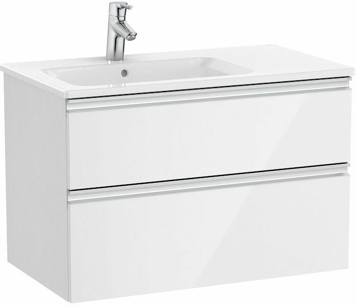 Méretek: 805 x 460 x 537 mm 2 fiókkal és balos mosdókagylóval Fényes fehér színben