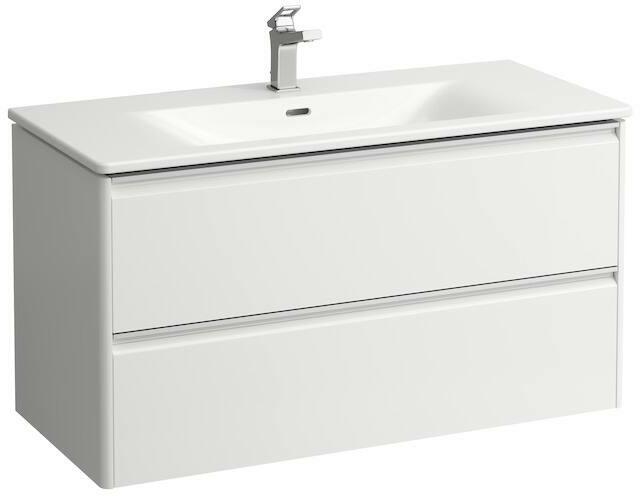 Laufen Kombi csomag 100 cm, vékony mosdó alsószekrénnyel, 2 fiókkal, fiók rendezővel együtt. Hagyományos vagy helytakarékos szifonnal H894240 szerelhető Kollekció: PALACE Opció: egy csaplyuk, középen Hossz: 985 mm Szélesség: 450 mm Magasság: 530 mm