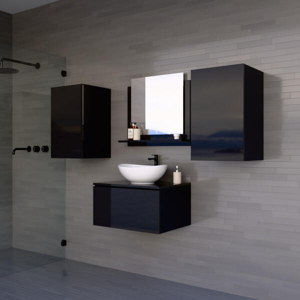 Venezia S-22 fürdőszoba bútor szett magasfényű fekete színben (matt fekete oldalsó elemek). A készlet tartalmazza a mosdószekrényt, 2 db faliszekrényt, a porcelánt mosdót szifonnal és a fali tükröt polccal. A mosdószekrény tágas helyet biztosít a tárolásra, az ajtó a felső rész enyhe megnyomásával lenyitható (push to open rendszer). 16 mm vastag bútorlapok, az élek AB