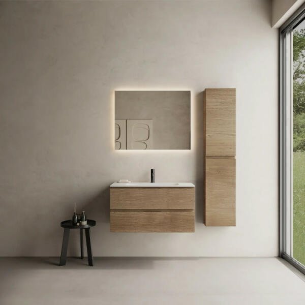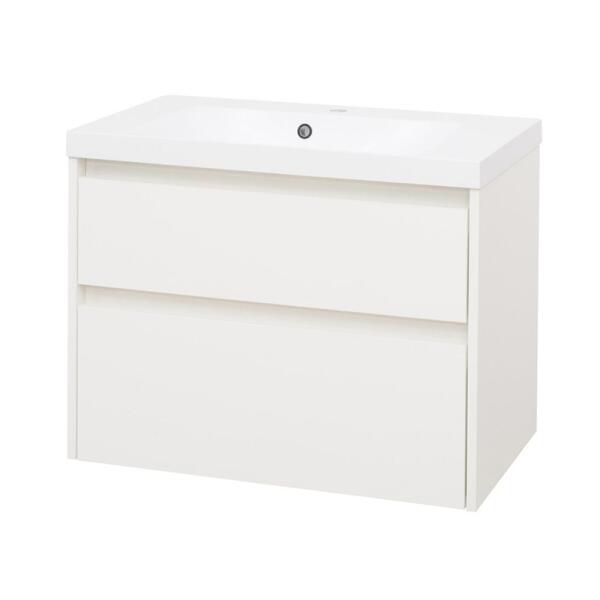 Iris 80cm-es 2 fiókos fürdőszobaszekrény matt fehér & füstölt tölgy + mosdó Iris 80cm-es 2 fiókos fürdőszobaszekrény matt fehér & füstölt tölgy + mosdó Kétszinű falra rögzíthető, laminált bútorlap fürdőszobabútor mart, fóliázott MDF előlappal. Csillapított záródású fiókok, ABS élzárás, beépített kerámia mosdóval. Tükör LED lámpával. Korpusz:
