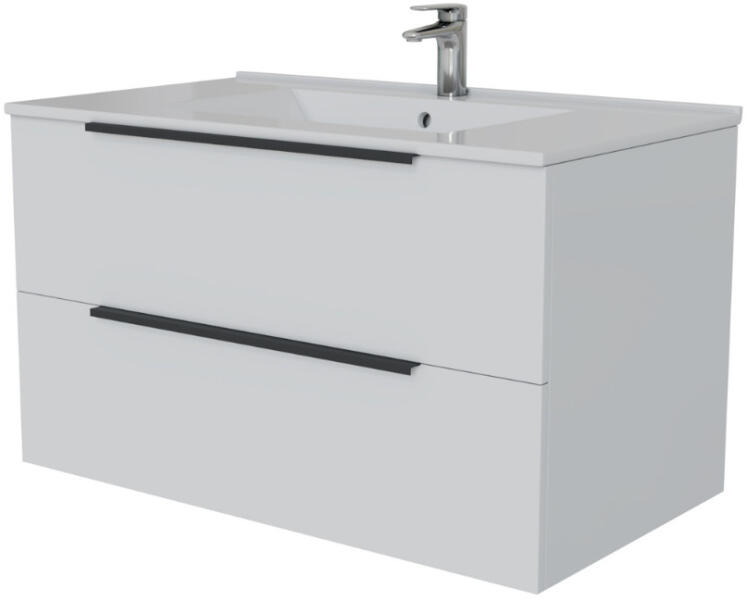 Intenso fiókos mosdószekrény magasfényű fehér felülettel. A fiók előlapok mellett az oldalak is magasfényű fehér felülettel rendelkeznek. 2 fiókos mosdószekrény, modern, hosszított kialakítású fekete fogantyúkkal az fiókokon. 16 mm vastag fiók front bútorkapok és korpusz. Az élek ABS élfóliával vannak lezárva, ami egyszerre esztétikus és véd a beázás ellen. A bú