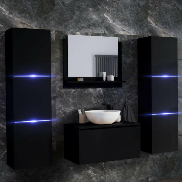 Venezia Like II. fürdőszoba bútor szett matt fekete színben. A készlet tartalmazza a mosdószekrényt, a faliszekrényt, a porcelánt mosdót (alább kiválasztandó) szifonnal és a fali tükröt polccal. A mosdószekrény tágas helyet biztosít a tárolásra, az ajtó a felső rész enyhe megnyomásával lenyitható (push to open rendszer). 16 mm vastag bútorlapok, az élek ABS élfóliá