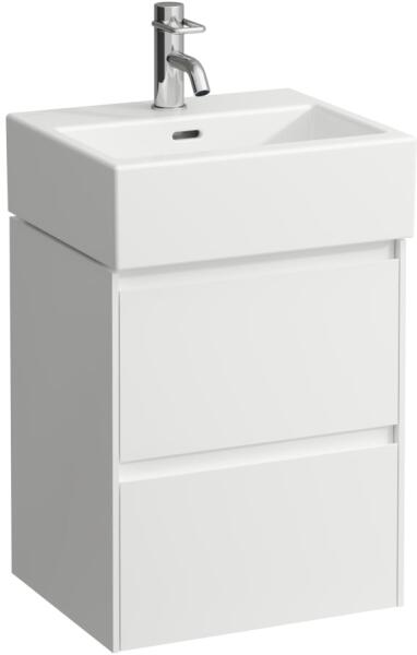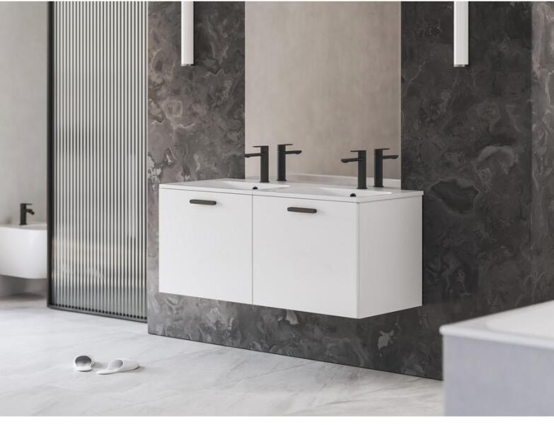 SD Chrome II dupla mosdó alatti szekrény fehér kivitelben. Fogantyúval fekete kivitelben. D Chrome II 120 két fiókos mosdó alatti szekrény (belső magassága 40 cm). A szekrény jobb oldali részében egy integrált, alacsony fiók található. A bal oldali részében pedig a 40 cm magasságú fiók található. A szekrény bal oldali részében nyílások találhatók az alacsony fiók k
