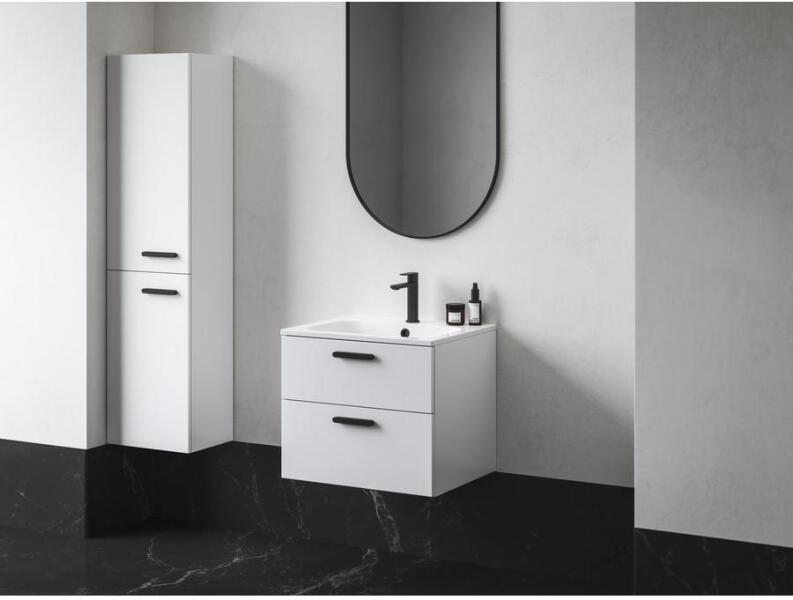 Termékjellemzők tartalmazza a következőket: mosdószekrény, helytakarékos szifon test alapanyaga: közepes sűrűségű farostlemez (MDF) test felületének anyaga: hőfólia elülső felület: közepes sűrűségű farostlemez (MDF) elülső rész felülete: hőfólia MoistureProof: tartós és ellenálló anyag fogantyúrúddal n yílás típusa: ajtó fogantyúk anyaga: alumínium foganty