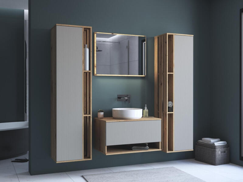 Easy 80cm-es két fiókos fürdőszobaszekrényf üstölt tölgy & beton Easy 80cm-es két fiókos fürdőszobaszekrény füstölt tölgy & beton Falra rögzíthető laminált bútorlap fürdőszobabútor mosdópulttal. Csillapított záródású fiókok. Tükör LED lámpával. A csapot, és a mosdót nem tartalmazza a szett! Méretek: Szélesség: 80cm Magasság: 55cm Mélység: 46cm