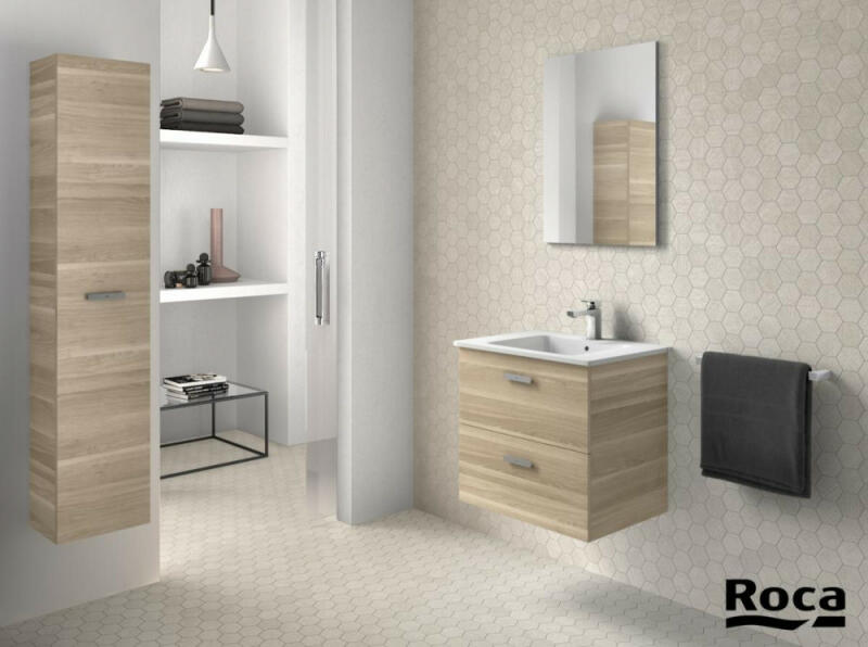 Roca Unik Victoria-N alsószekrény mosdóval 60 cm nyír A855854422 Méret: 60,5x46x56,5 cm 2 fékezett záródású fiók Kerámia mosdó, csaplyukkal túlfolyóval Opcionálisan rendelhető: bútorláb, törölközőtartó Csaptelep és leeresztő nélkül
