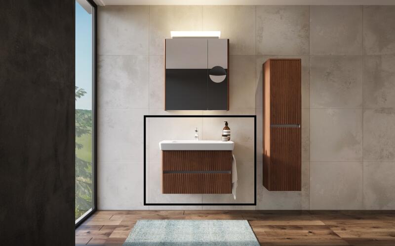 Milla 80 alsó+ Roca mosdótál|Mosdótál: kerámia|Méret: 80x53x45 cm|Fali rögzítéssel|2 fiókos|Törölközőtartó Mara: 2 db - a szekrény két oldalán|Fiókrendező: 1 db - alsó fiókba|Korpusz és front: vákuumpréselt MDF front és oldalak, laminált lapok|Szálcsiszolt alu bemart foganytú|Vasalatok: teljes kihúzású, csillapított záródású önbehúzó vasalatok (Terhelhetős