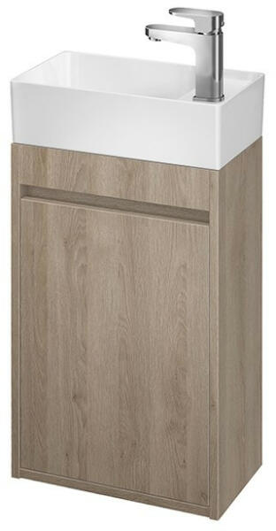 Cersanit Crea 1 ajtós fali szekrény és kerámia mosdóval 40x22 cm, tölgy S801-286A rejtett fogantyús fiókok elülső részeit és a szekrénytestet fényes fehér lakk borítja, a mosdókagylón túlfolyó és lyuk a csap számára. A szekrény előlapja és váza nedvességálló forgácslapból készült, köszönhetően az AQUASAFE technológia használatának, amely hosszú évekig tök