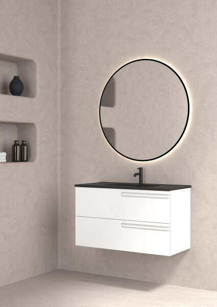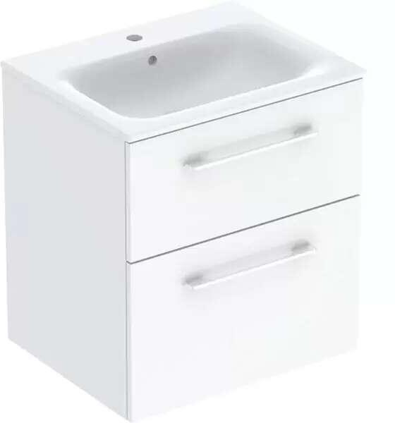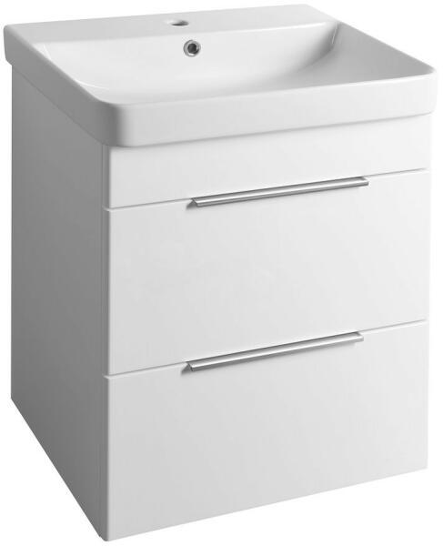 Sapho BRUCKNER NEON két fiókos alsószekrény mosdóval 60x48 cm, fehér 501.117. 0 Garancia: 2 év Telepítés: falra Forma: szögletes Szín: fehér Szekrény jellemzői: Anyag: MDF/laminált Szélesség: 573 mm Mélység: 445 mm Magasság: 640 mm Magasság mosdóval: 710 mm Kivitel: 2 fiókos, lágy és halk záródás Krómozott fogantyúval Mosdó jellemzői: Anyag: szaniter kerámia Széle