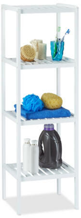 NARA 4 Polcos Bambusz Fürdőszoba Polc Teljes mérete: 110 x 34,5 x 33 cm (Ma x Szé x Mé) Polcok mérete: 31,5 x 31,5 cm Polcok közötti távolság: kb. 27,5 cm Terhelhetősége polconként: max. 5 kg Anyaga : bambusz Súlya: kb. 3,4 kg Szín: Fehér (Lakkozott)