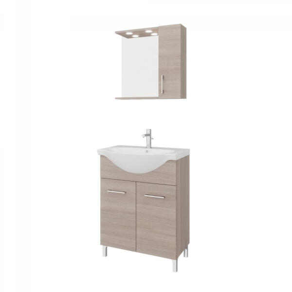 Rubino 65cm-es két ajtós fürdőszobaszekrény polccal füstölt tölgy + mosdó Rubino 65cm-es két ajtós fürdőszobaszekrény polccal füstölt tölgy + mosdó Krómozott állítható lábakkal, beépített kerámia mosdóval, csillapított záródású ajtókkal, krómozott ABS fogantyúkkal. Tükör LED lámpával, nyitható szekrénnyel. A csapot nem tartalmazza a szett! Méretek: Széles