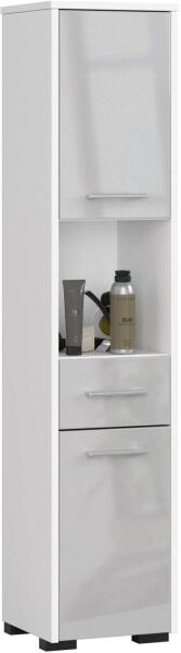FÜRDŐSZOBA SZEKRÉNY FIN 2D 1SZ 1W Kopásálló, 16 mm-es laminált kartonból készült. Szélei ABS szegéllyel borítottak. Fehér színű, fényes fémfrontok. Méretek: Hosszúság - 30cm Magasság - 140cm Mélység - 30cmA FIN 2D modern fürdőszobai állvány ideális tároló polc kis fürdőszobákba. Jól használható más fürdőszobabútorok kiegészítéseként vagy önálló búto