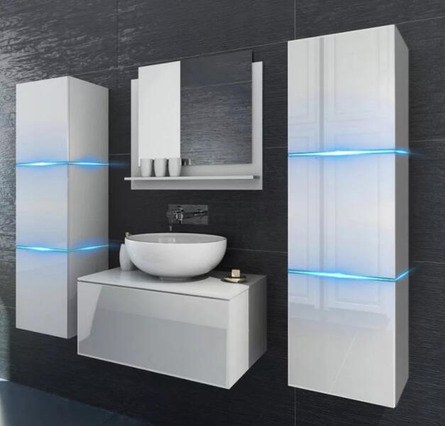 Venezia Alius-3 fürdőszoba bútor szett magasfényű fehér színben (matt fehér oldalsó elemek). A készlet tartalmaz összesen 4 faliszekrényt, a mosdószekrényt, a porcelánt mosdókagylót szifonnal és a tükröt. A faliszekrények egymástól tetszőleges távolságra szerelhetőek, a szekrények közötti rész tökéletes helyet nyújt a tárgyak elhelyezésére. A mosdószekrény t