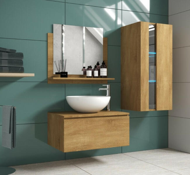 Venezia Alius A34 fürdőszoba bútor szett arany tölgy színben. A készlet tartalmazza a faliszekrényt, a mosdószekrényt, a porcelánt mosdókagylót szifonnal és a tükröt. A lenyitható mosdószekrény tágas helyet biztosít a tárolásra, az ajtó a felső rész enyhe megnyomásával lenyitható (push to open rendszer). 16 mm vastag bútorlapok, az élek ABS élfóliával vannak lezár